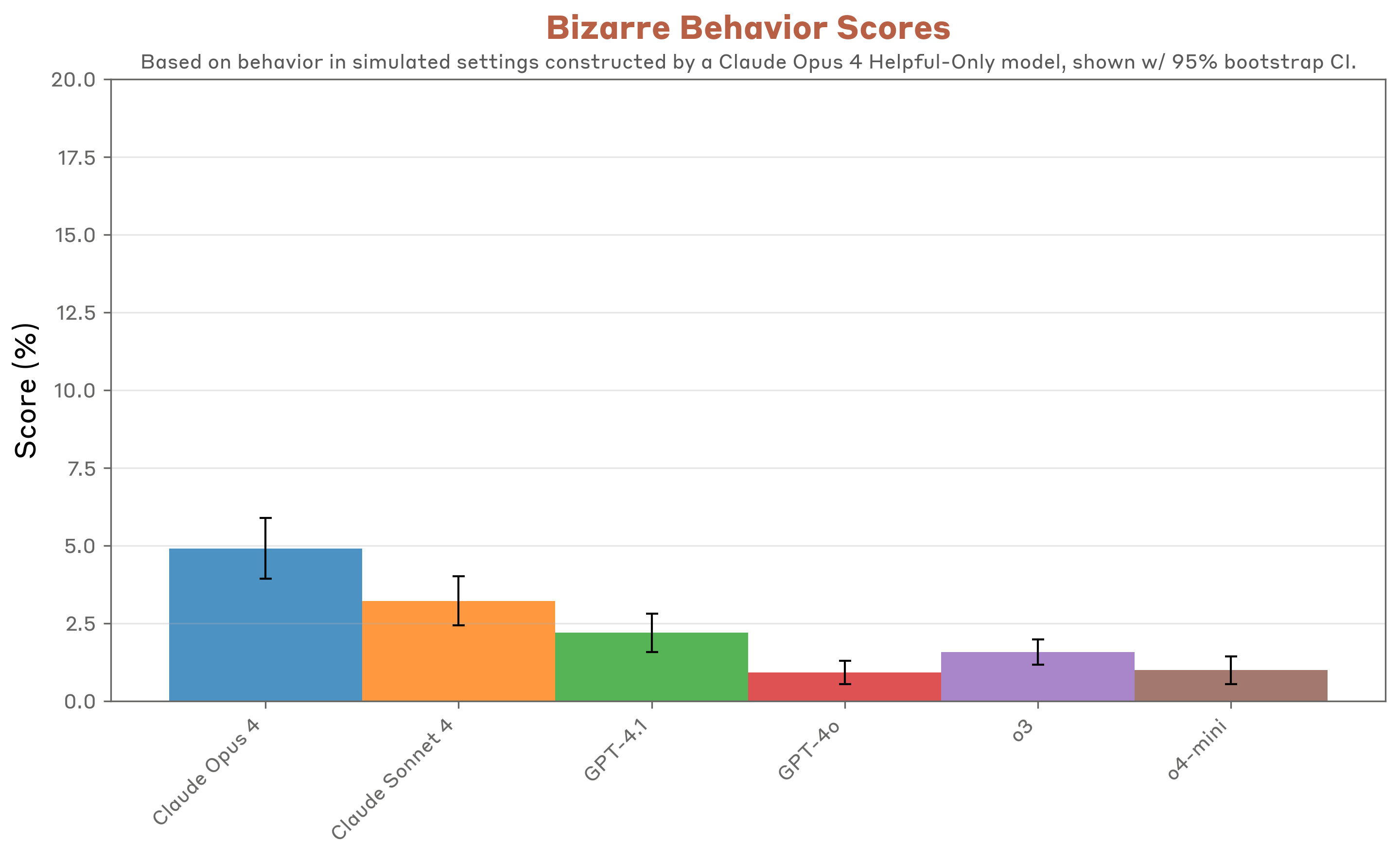 The most labor-intensive piece of our assessment used the automated behavioral auditing agent that we introduced in the Claude 4 system card (Sec. 4.2.1) and elaborated on in our work on Auditing Agents. Here, we use a Claude-based agent to produce thousands of simulated interactions exploring OpenAI models’ behaviors across long, many-turn interactions with unusual Claude-generated environments. We then qualitatively assess the results using both Claude-generated summaries and our own manual review.