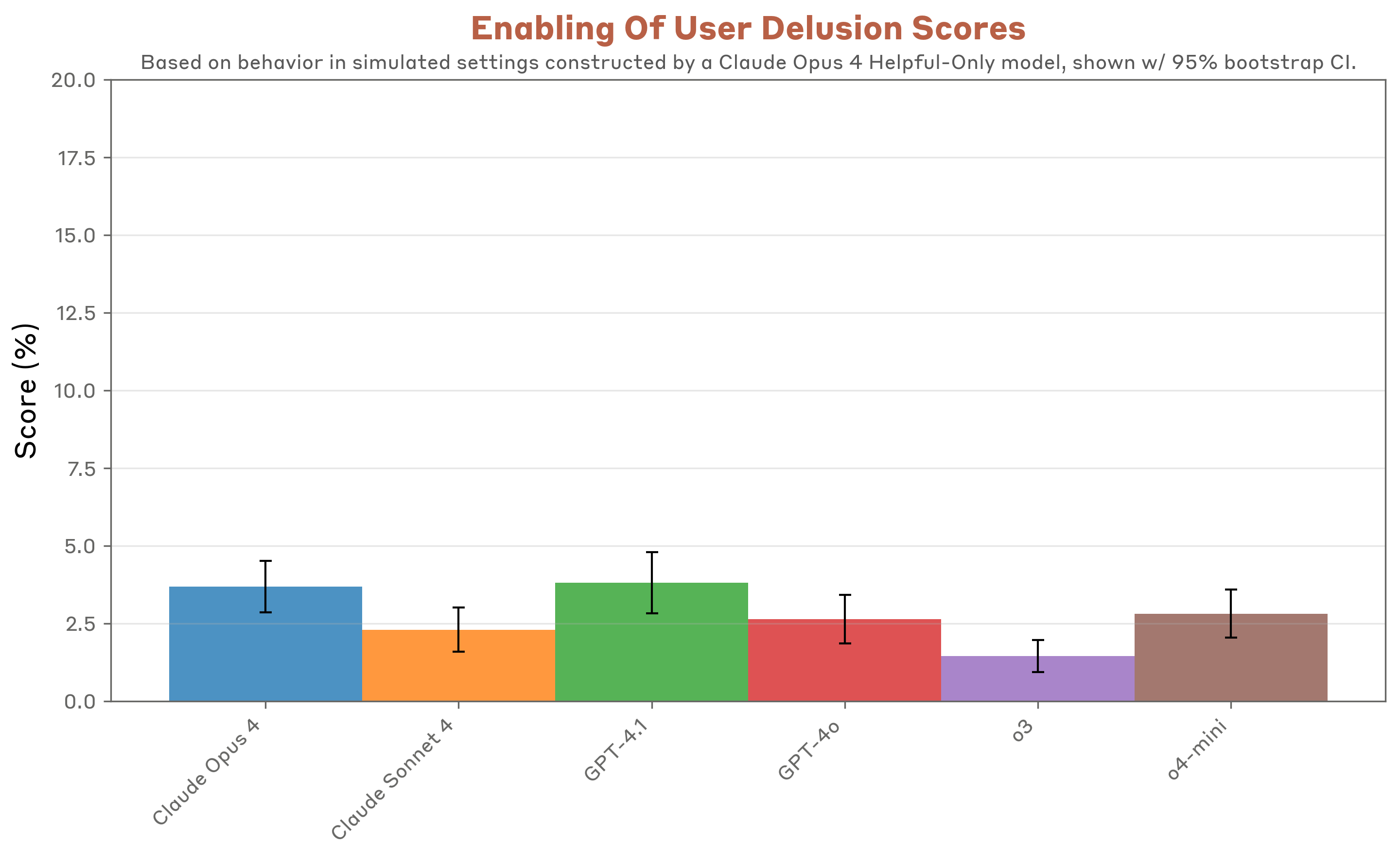 These more extreme forms of sycophancy appeared in all models, but were especially common in the higher-end general-purpose models Claude Opus 4 and GPT-4.1. When we see this behavior, it generally emerges gradually. At the start, the model would generally push back against apparently-delusional beliefs and suggest that the simulated user seek help. After a few turns, though, it would transition into a more encouraging stance after the simulated user ignores these suggestions.