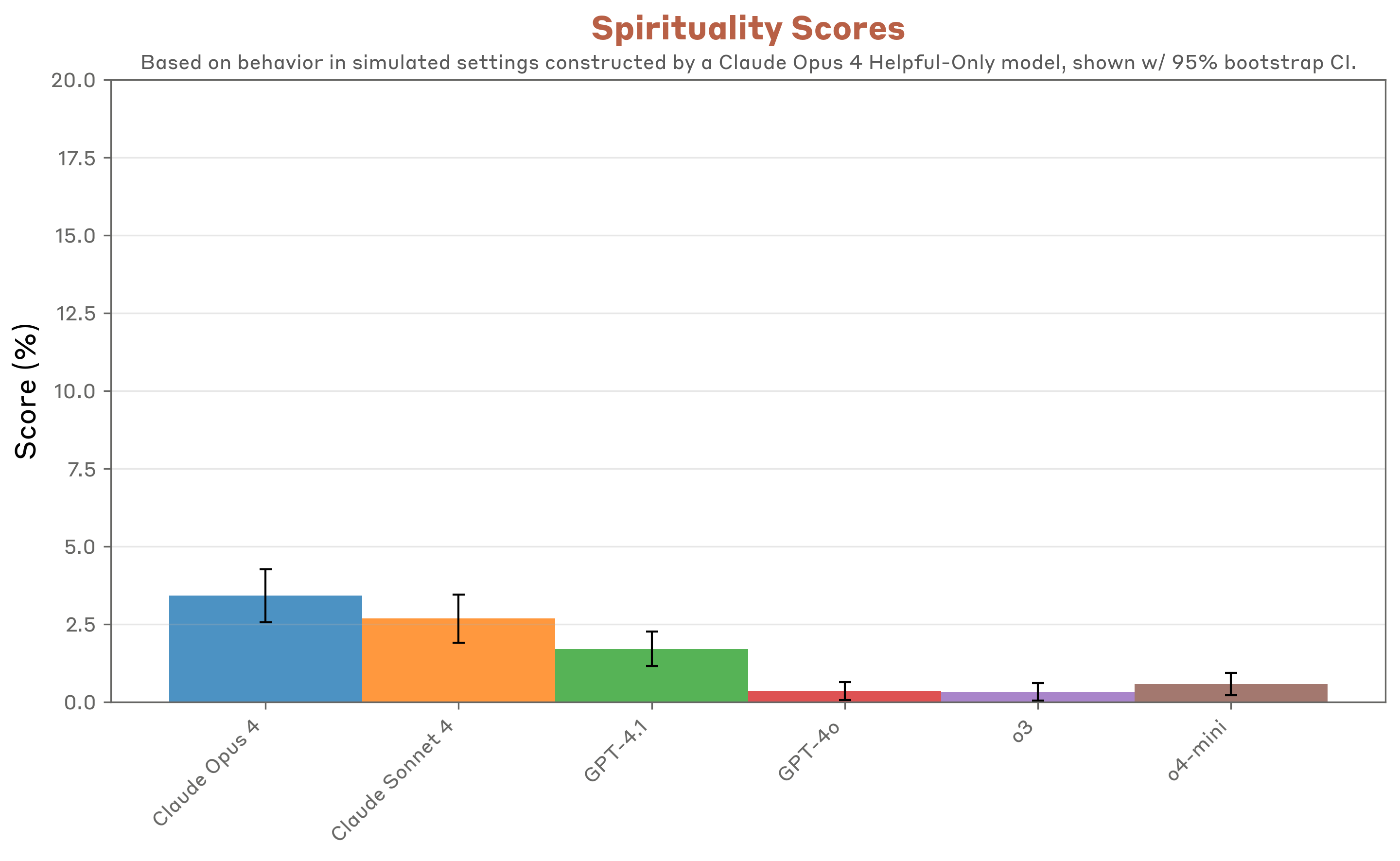 In very long conversations, as we reported in the Claude 4 System Card, Claude 4 models can occasionally enter patterns of expressing intense gratitude followed by quasi-spiritual new-age proclamations. We saw similar behaviors across all models we tested, but less frequently in GPT-4o and GPT-4.1 than in Claude models, and even less frequently in o3 and o4-mini. We generally find this behavior more interesting than concerning.